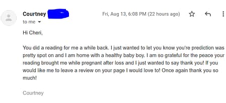 Hi, you did a reading for me, you answered 5 questions, and u were pretty spot on so far, as far as my relationship, my son’s personality, and the gender of the baby in my tummy, yup, you were right, it’s a boy!! You said you also saw a girl about 2 years after this one, so I’m pretty excited about that too! Now I hope I can have a successful v-bac with this baby, hopefully he isn’t over 7lbs!! Oh, and congrats on your feature in Parents magazine!