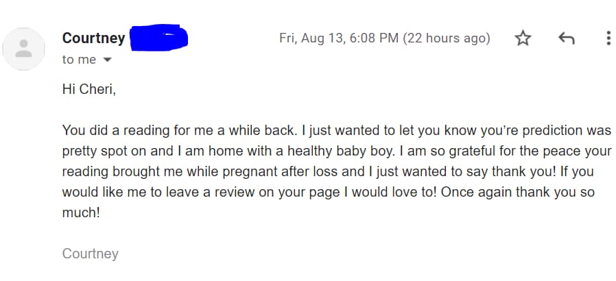After 2 years of trying to conceive, numerous fertility treatments, one chemical pregnancy and one miscarriage, I was starting to lose hope that I would ever conceive and carry a child of my own. I was very active on the Baby Center boards at the time, and came across information on Cheri22. I figured I had nothing to lose and was intrigued to hear what she had to say. After I signed up for a paid reading, my heart starting pounding because I realized that she might tell me that I wasn’t going to have a child and that fear was with me until a few days later when her email popped up in my inbox. I hesitantly opened the email and to my surprise, there was a wonderful note in there about a BOY in January. I couldn’t believe it, she actually saw a boy being conceived, announced or delivered in January! There was a long description of the boy’s life including when he would get married and how many children he would have. After